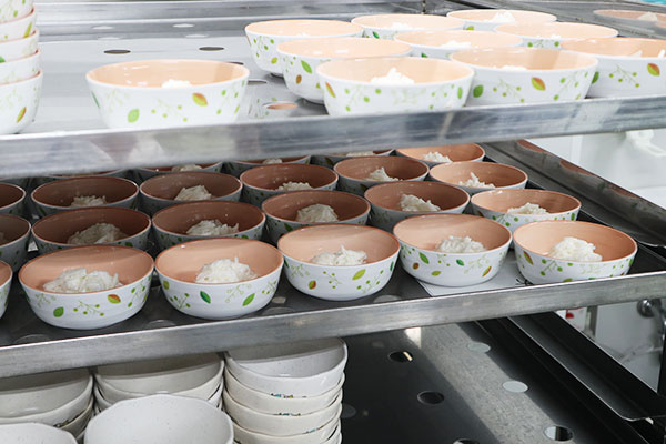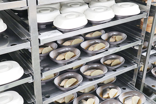 当院では、調理後の食事を急速冷却し、冷たいまま器に盛り付けて、配膳直前に器ごと加熱する調理システム(ニュークックチル方式)を取り入れています。