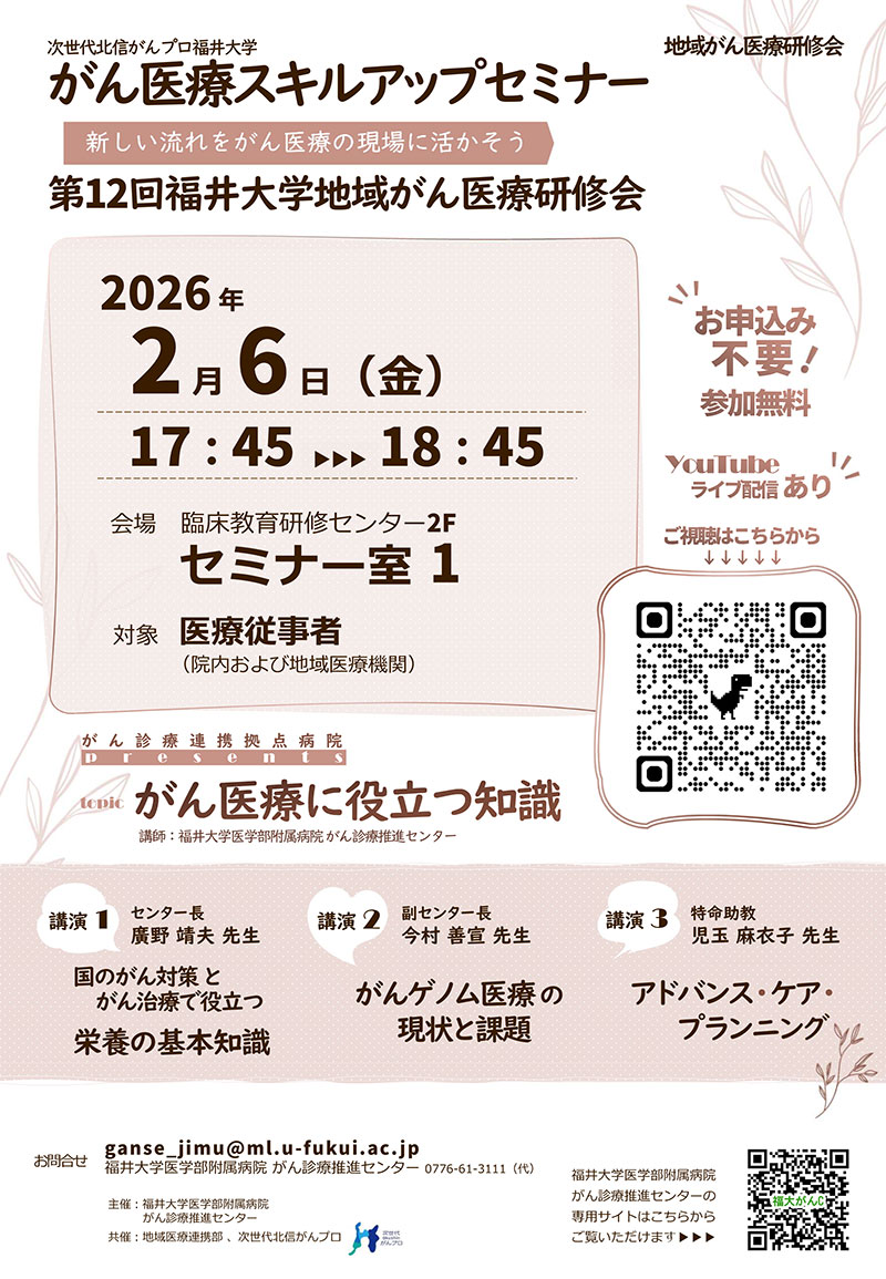 本院がん診療推進センターでは、令和8年2月6日(金)に第12回福井大学地域がん医療研修会を開催します。是非ご参加ください。
