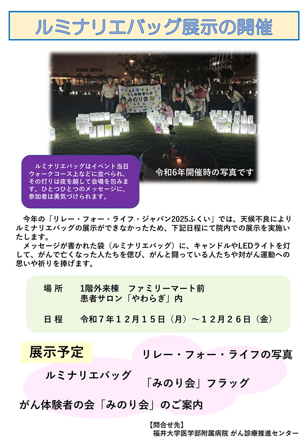 お知らせ がん診療推進センター お知らせ イベント・セミナー情報 「ルミナリエバッグ展示」を開催します お知らせ イベント・セミナー情報 TOPニュース 2025.12.12 「ルミナリエバッグ展示」を開催します がん診療推進センターでは、令和7年10月18日(土)に参加した「リレー・フォー・ライフ・ジャパン 2025 ふくい」で展示予定だったルミナリエバッグを、下記の日程で院内にて展示いたします。是非お立ち寄りください。 ※詳細はチラシをご覧ください。 日 程 令和7年12月15日(月)~12月26日(金) 場 所 1階外来棟 ファミリーマート前患者サロン「やわらぎ」内 一覧に戻る お知らせカテゴリ イベント・セミナー情報